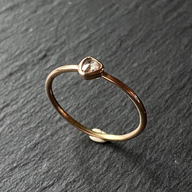 トライアングル型のスライスダイヤモンドを 細いワイヤーでとり囲んだシンプルな ベゼルセッティングのリング。 黒いカーボンの内包物がピリッと辛口のアクセントに。 地金は優しい色味のK10YG。 MATERIAL:K10YG RING SIZE:14号 原石を生かして板状にスライスしたダイヤモンド。 形、色、サイズ、インクルージョン(内包物)の掛け合わせで 唯一無二の個性を放ちます。 途方もなく長い時間をかけて自然が作り上げた希少な鉱物を 隅々まで価値ある存在として楽しむことができるのが スライスダイヤモンドの魅力です。