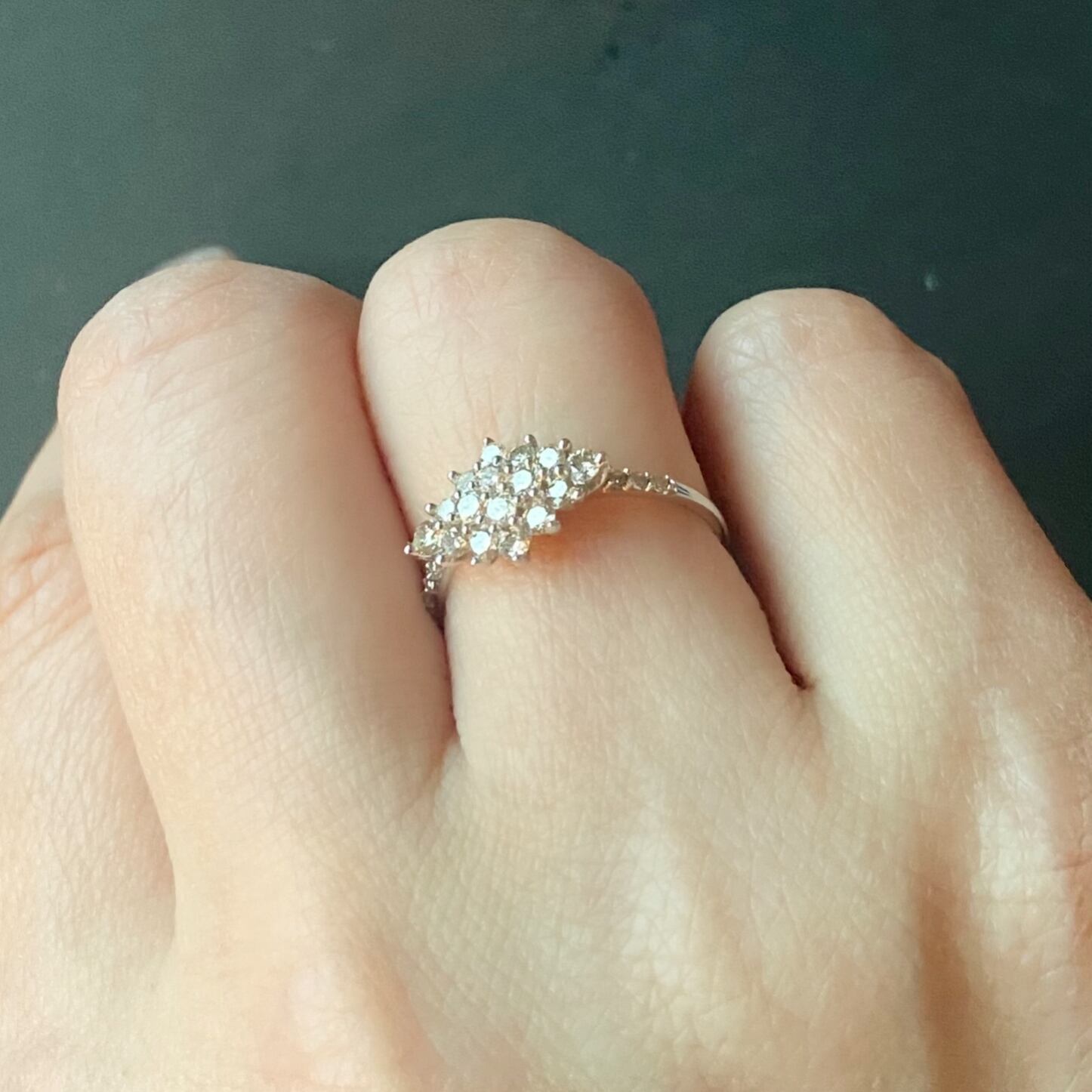 かすかにグレーがかったメレダイヤ16石をロンバス(ひし形)状に配した可憐なリング。